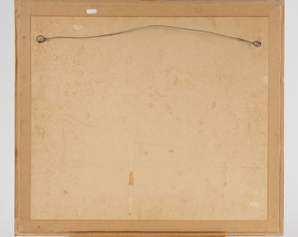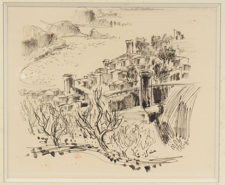 Ecole française Xxème. "Village fortifiée en bord de mer" Encre, monogrammée Dim à vue. 28,5 x 34,5 cm
