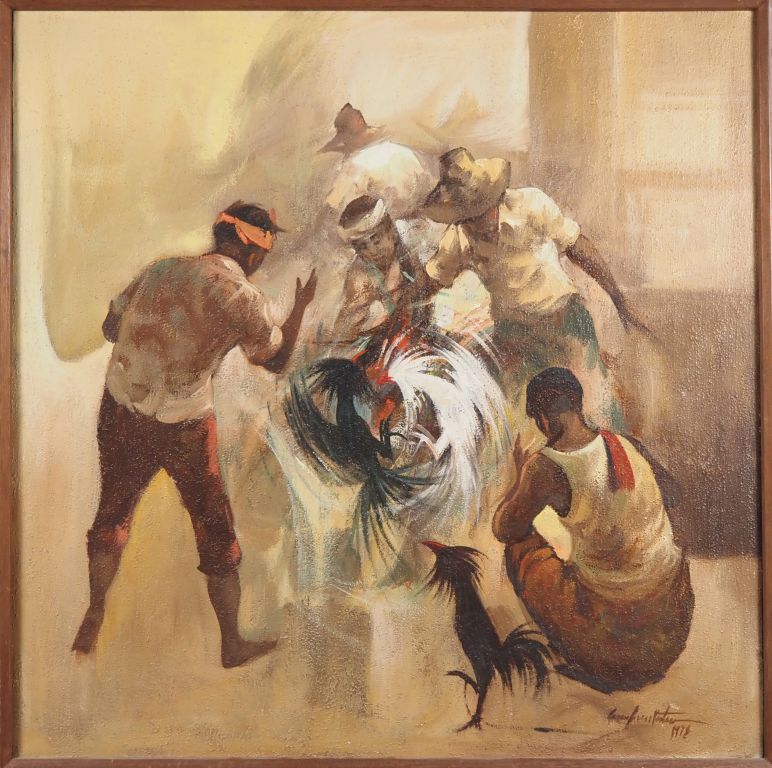 Ecole malgache XXème. "le combat de coqs" Huile sur toile, signée en bas à droite et datée Dim. 92 x 92 cm