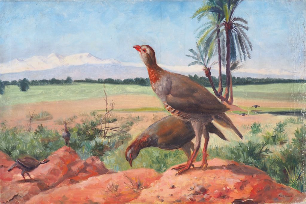 Elie MILLER-RANSON. "Gibier dans un paysage exotique". Huile sur toile, signée Dim. 54 x 80,5 cm. (Sauts de peinture).