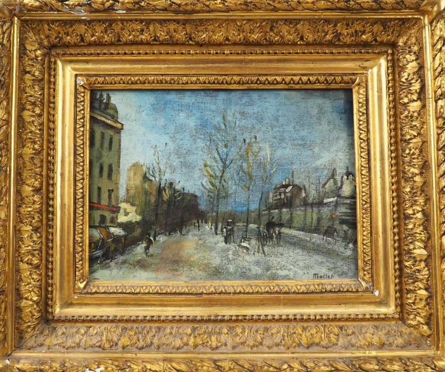 Elisée MACLET. "Vue de Paris en hiver". Huile sur panneau, signée en bas à droite. Dim. 21 x 28 cm.