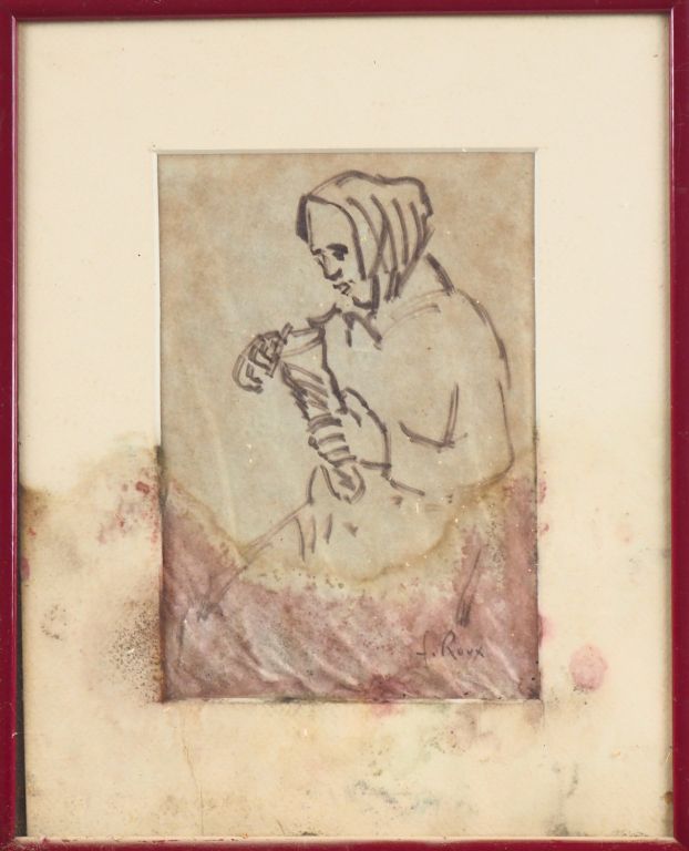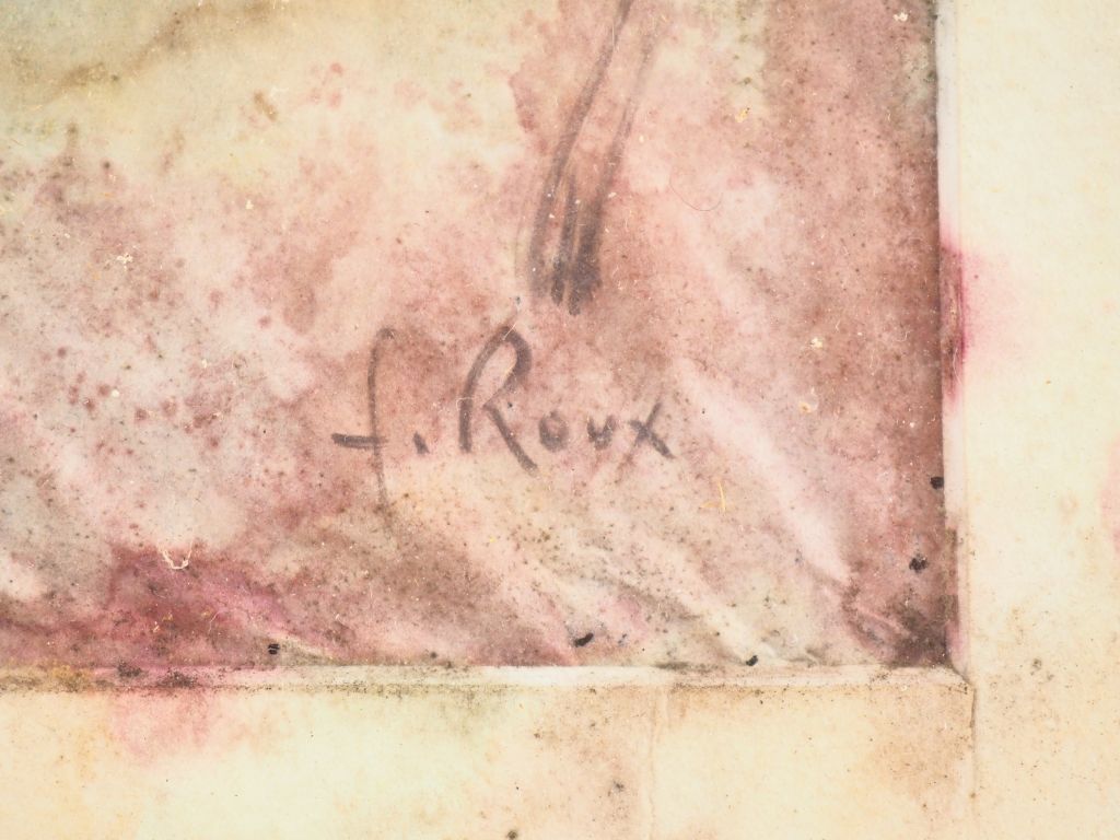 Fernand ROUX. "Portrait de dame au fichu". Dessin, signé en bas à droite. Dim. (à vue) : 19,5 x 13,5 cm.