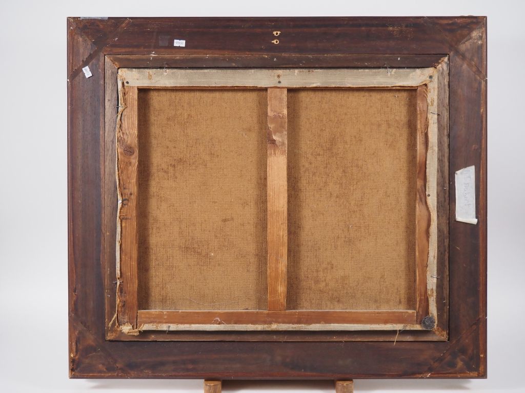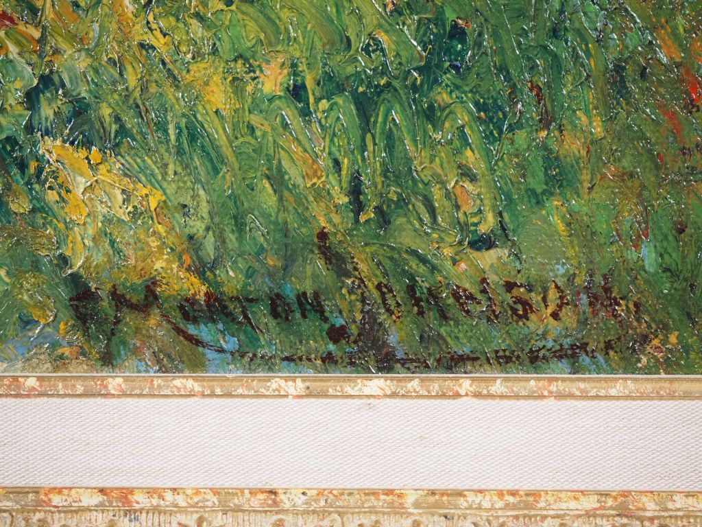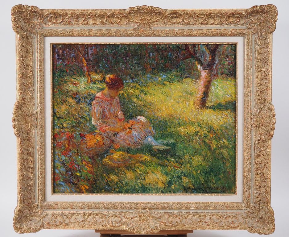 Francis MORTON JOHNSON. "jeune femme cueillant des fleurs" Huile sur toile, signée en bas à droite Dim. 50 x 60,5 cm