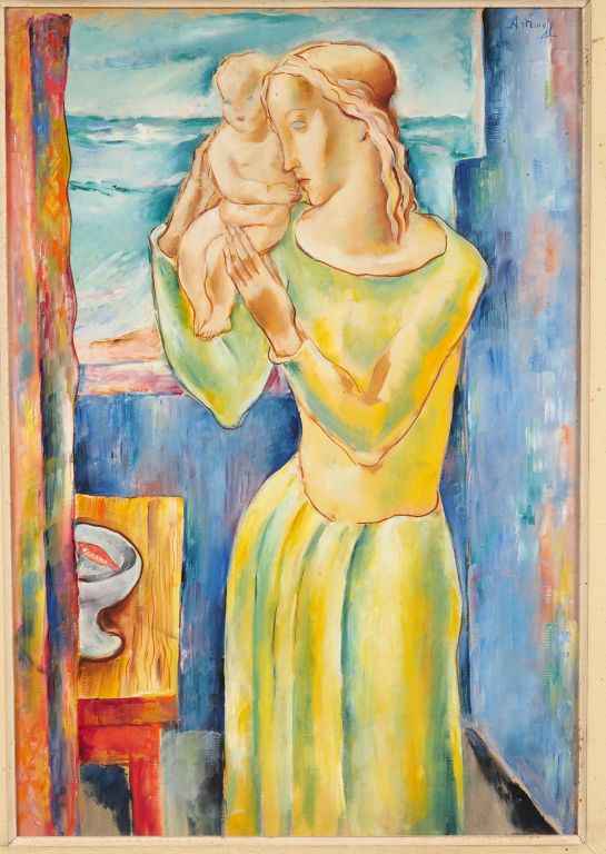 G. ARTEMOFF. "Mère et son enfant". Huile sur carton, signée en haut à droite. Dim. : 55 x 37,5 cm.
