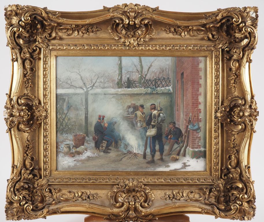 G. CLARIS. "Les soldats à la gamelle" Gouache, signée en bas à droite, dans son cadre d'époque en bois et stuc doré ajouré (petits éclats) Dim. À vue : 34 x 45 cm
