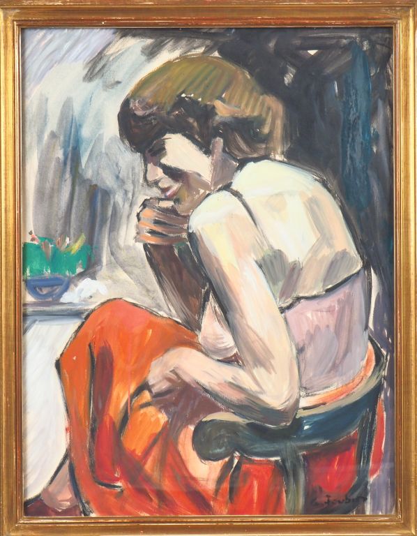 G. JOUBIN. "Femme assise, combinaison, jupe rouge" Huile sur papier, signée en bas à droite. Dim. 64 x 49 cm