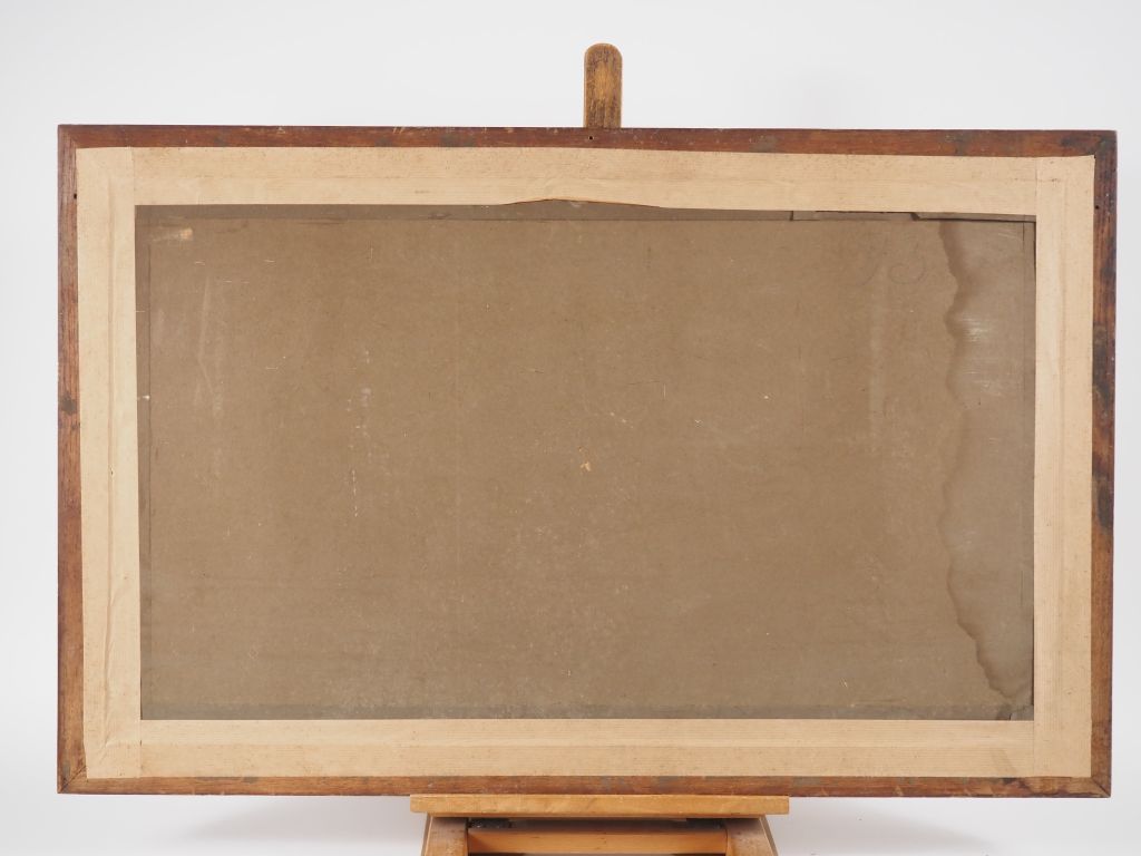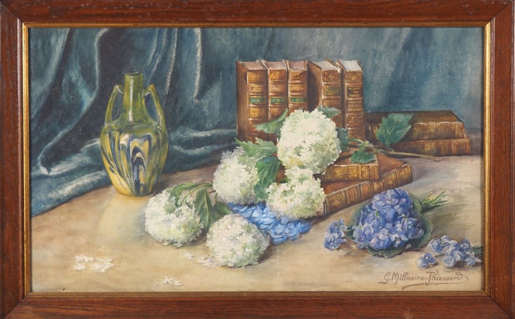 G. MILINER-THIESSARD. "nature morte aux hortensias et aux livres" Aquarelle, signée en bas à droite Dim. 45,5 x 78 cm