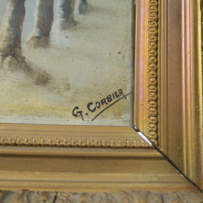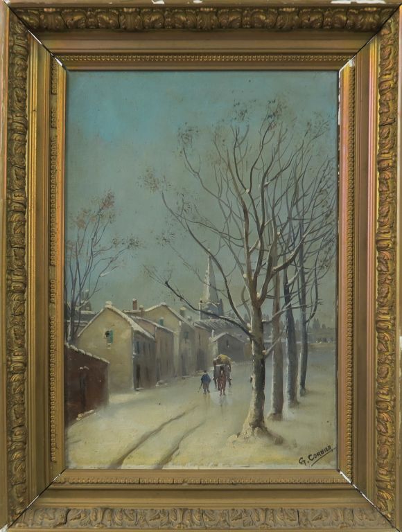 Gaston CORBIER. "Village enneigé". Huile sur toile, signée en bas à droite. Dim. 42 x 29 cm.