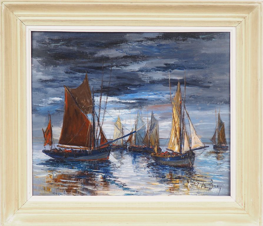 GEO BORY. "Thoniers à l'ancre" Huile sur toile. Signée en bas à droite. Dim : 45,5 x 55 cm.