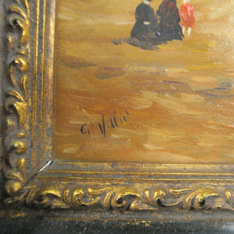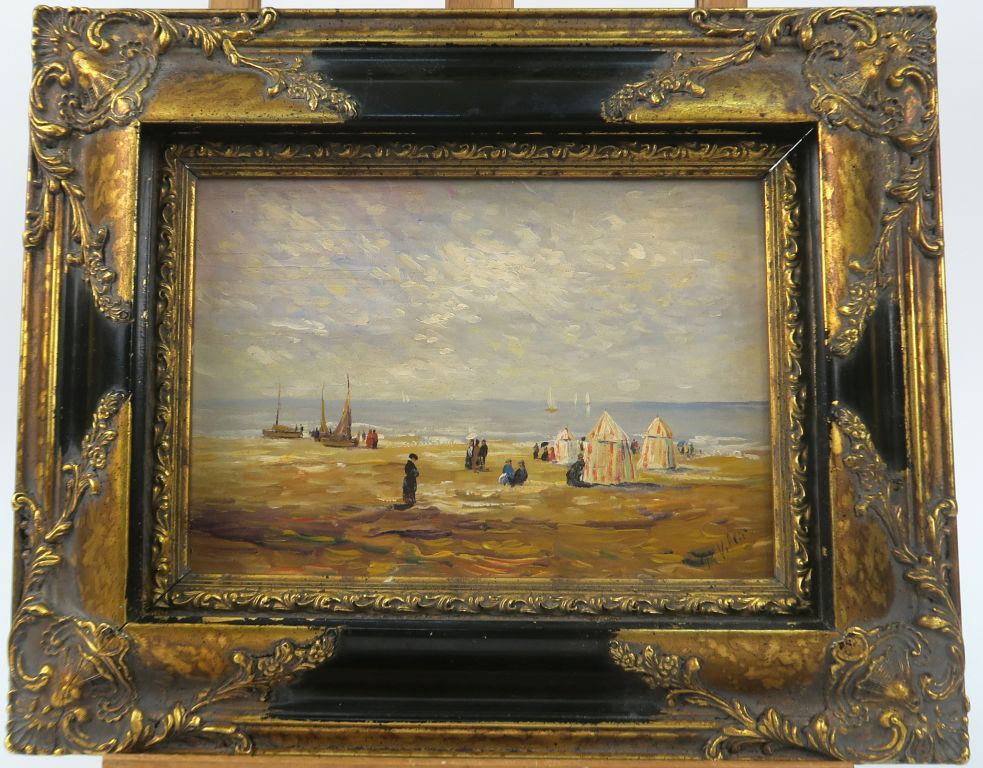 Georges VILLIE. "Bains de mer à la Belle Epoque". Paire d'huiles sur panneaux, signées. Dim. 19 x 26,5 cm.