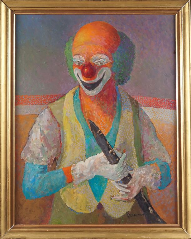 GERARVIEL. "Clown musicien" Huile sur carton, signée en bas à droite ...