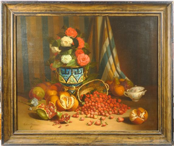 Giovanni CALVINI "Nature morte aux bouquets de fleurs et aux fruits" Huile sur toile (rentoilée). Signée en bas à gauche. 81,5 x 100,5 cm