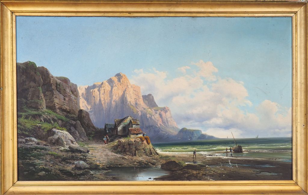 GODCHAUX. "Bord de mer animé". Huile sur toile, signée en bas à gauche. Dim. 55 x 92 cm. (très légères tâches)