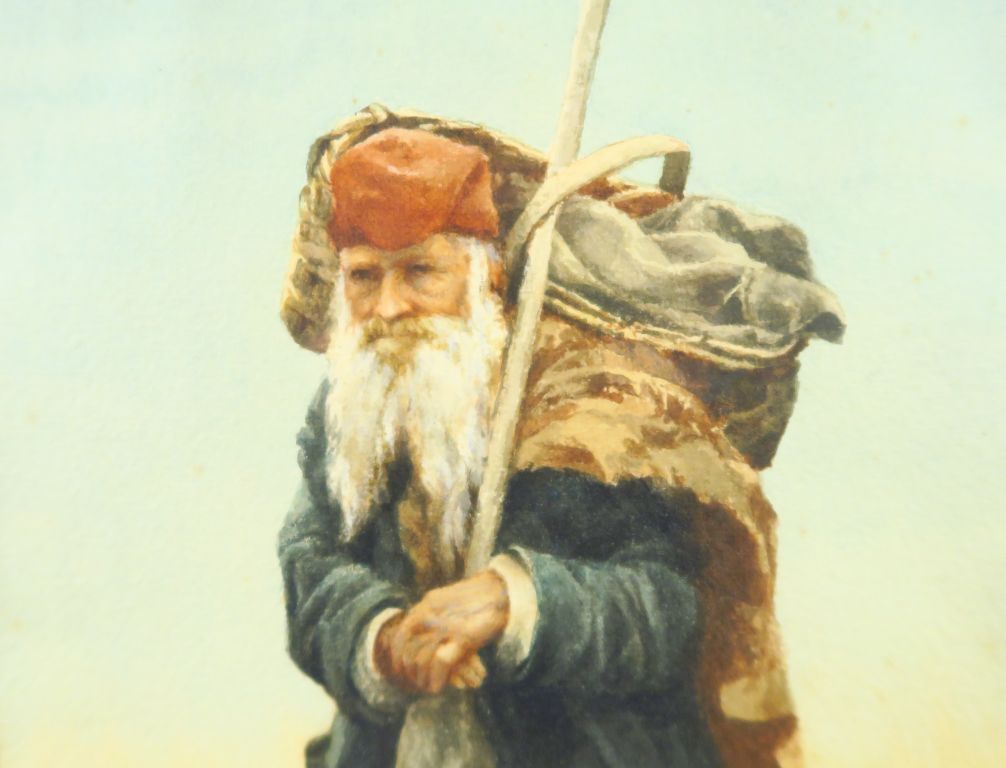 H. ALCHIMEWICZ "Vieil homme au baluchon" Aquarelle. Signée en bas à gauche. 39,5 x 23,5 cm