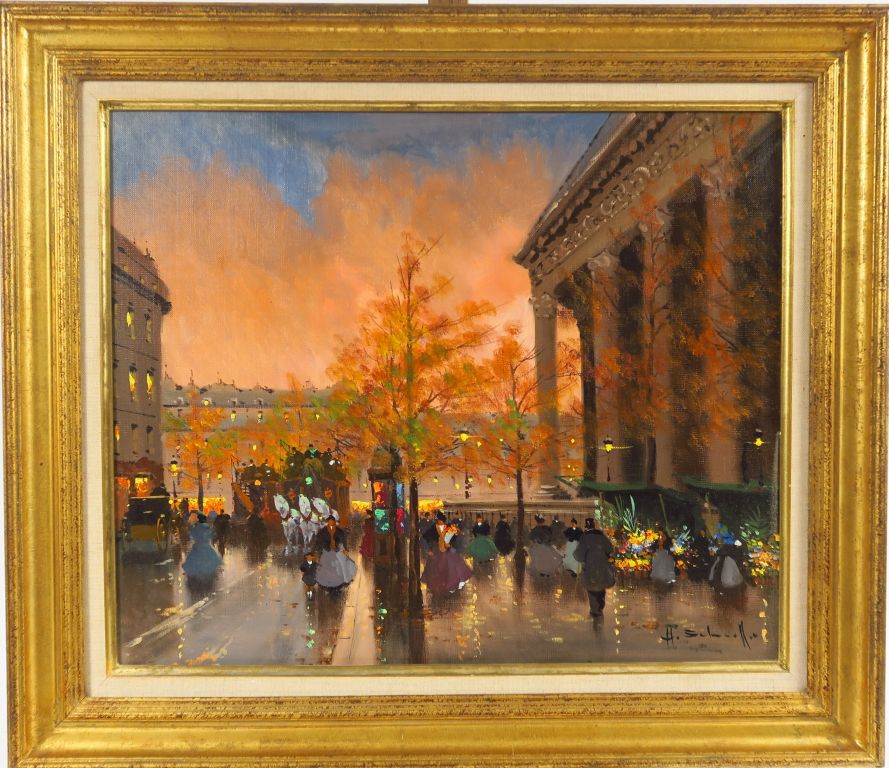 H. SCHAEFFER. "La place de la Madeleine animée". Huile sur toile, signée en bas à droite, Dim. 46 x 55 cm