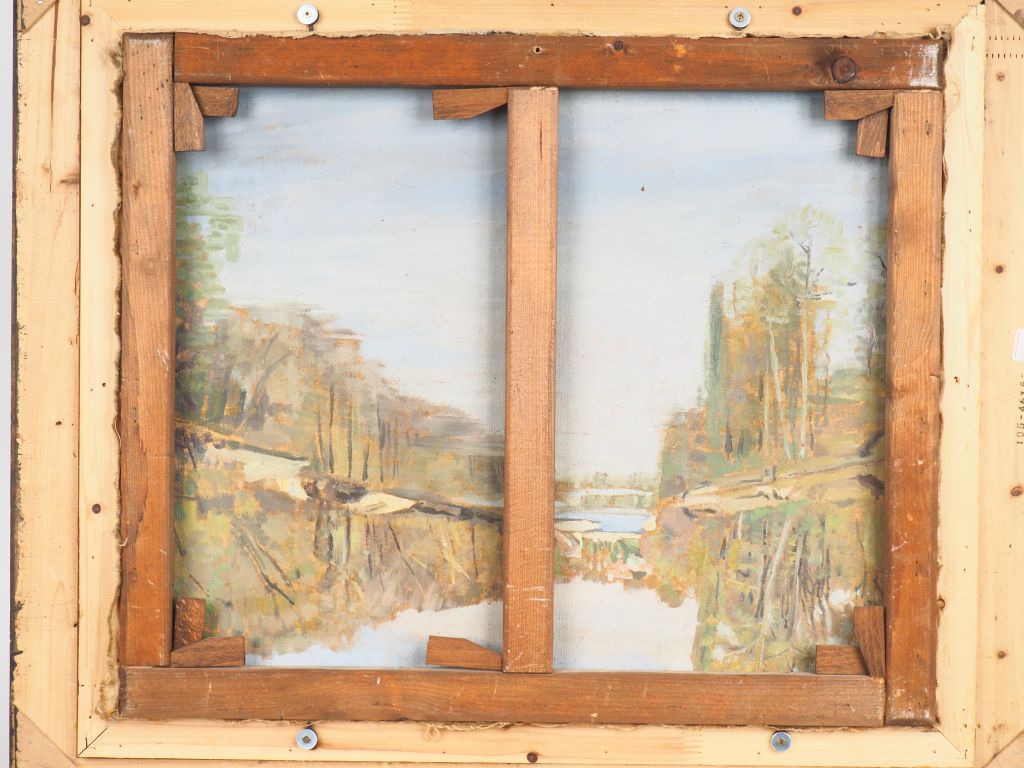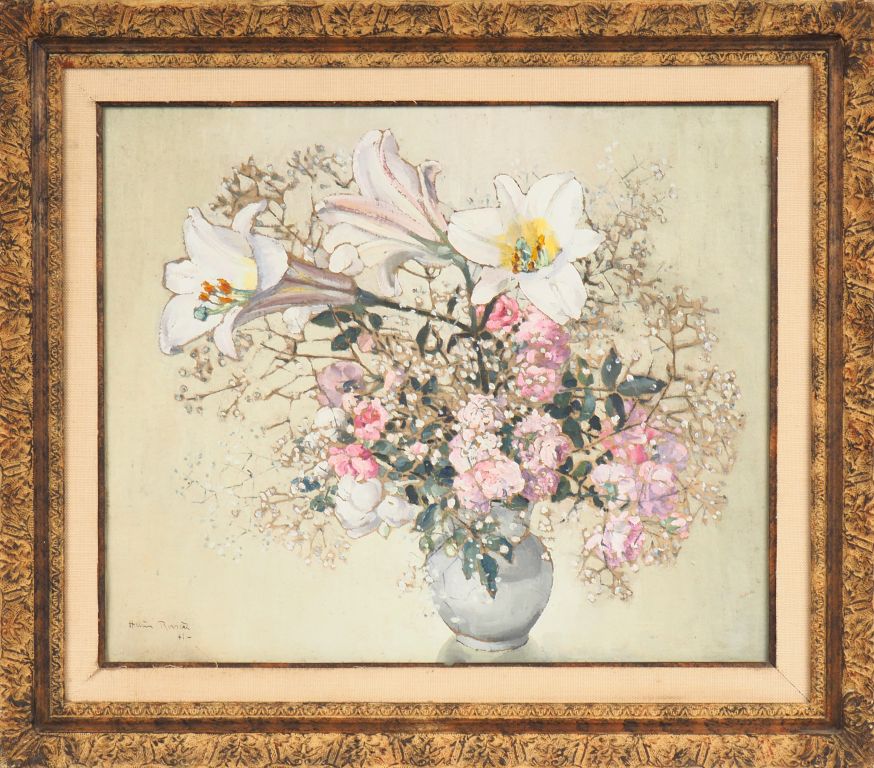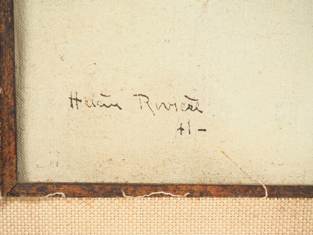 Hélène RIVIERE. "Bouquet de fleurs dans un vase" et "paysage". Huile sur toile double face signée en bas à gauche et datée 1941 (?) Dim. 46 x 55 cm.