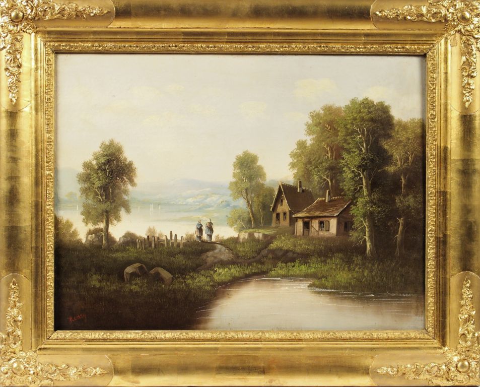 HENRY 'Paysage lacustre animé'. Huile sur toile, signée en bas à gauche. 49 x 65 cm