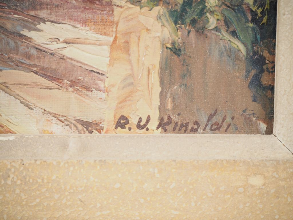 Hervé RINALDI. "Ruelle animée à Villefranche de Conflens" Huile sur toile, signée en bas à droite Dim. 33 x 46 cm (trous)