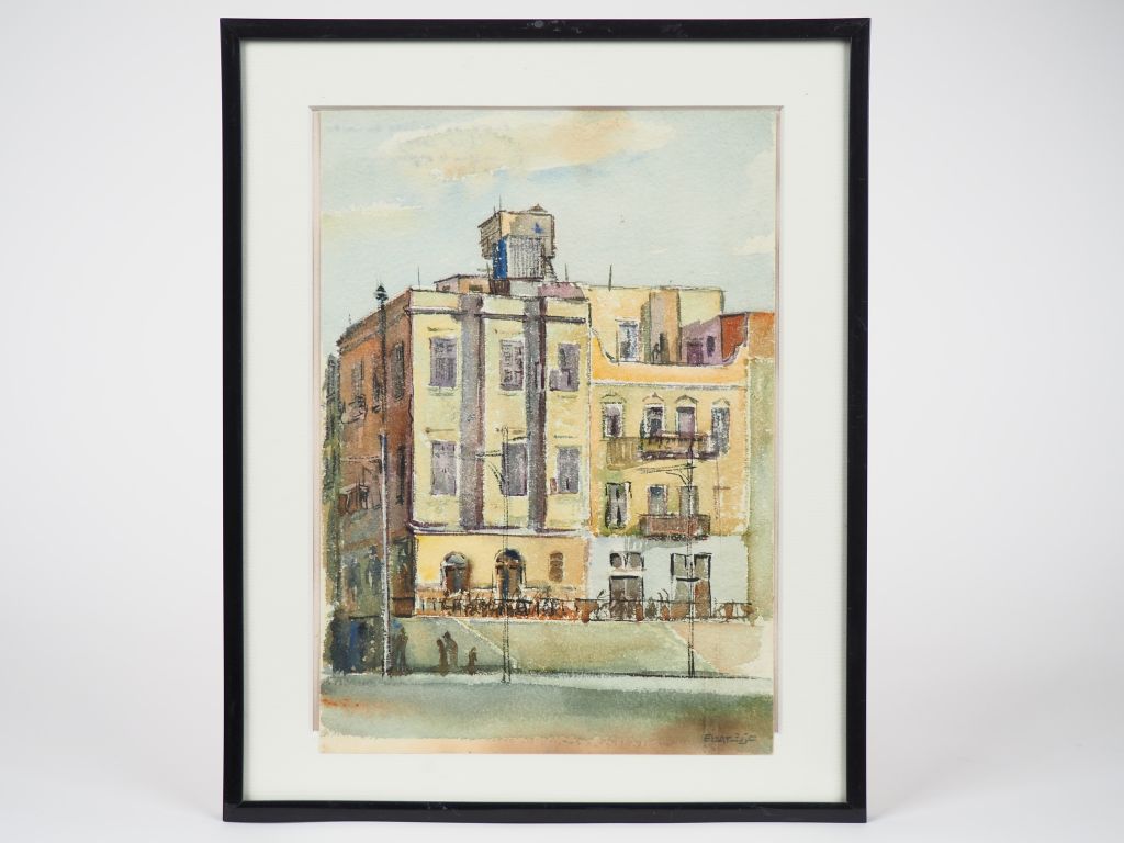 Ibrahim EZZAT. "Le café sous le pigeonnier à Alexandrie". Aquarelle, signée en bas à droite. Dim. 27,5 x 17,5 cm.