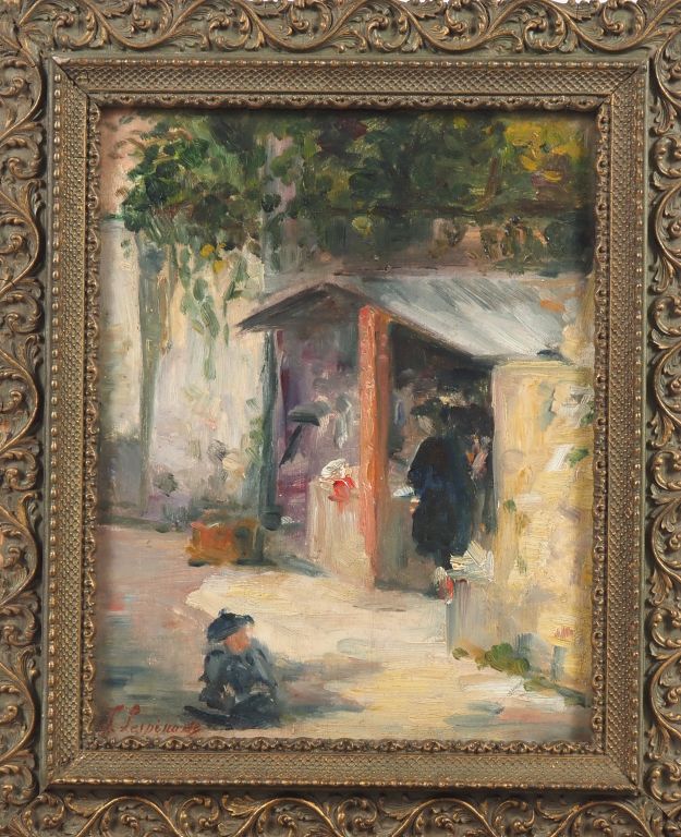 Isabelle LESPINASSE. "près du lavoir" Huile sur panneau, signée en bas à gauche Dim. 24 x 19 cm