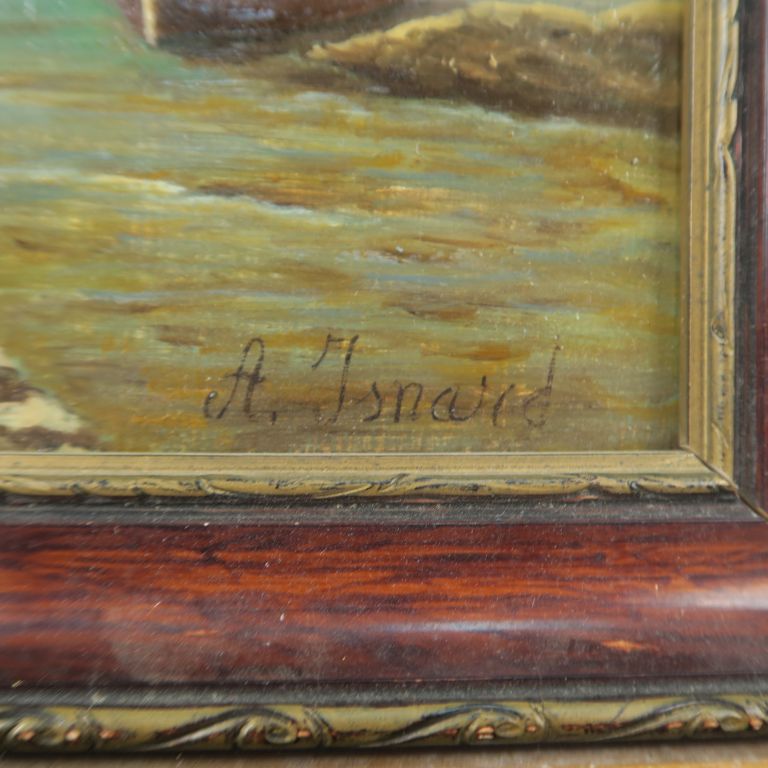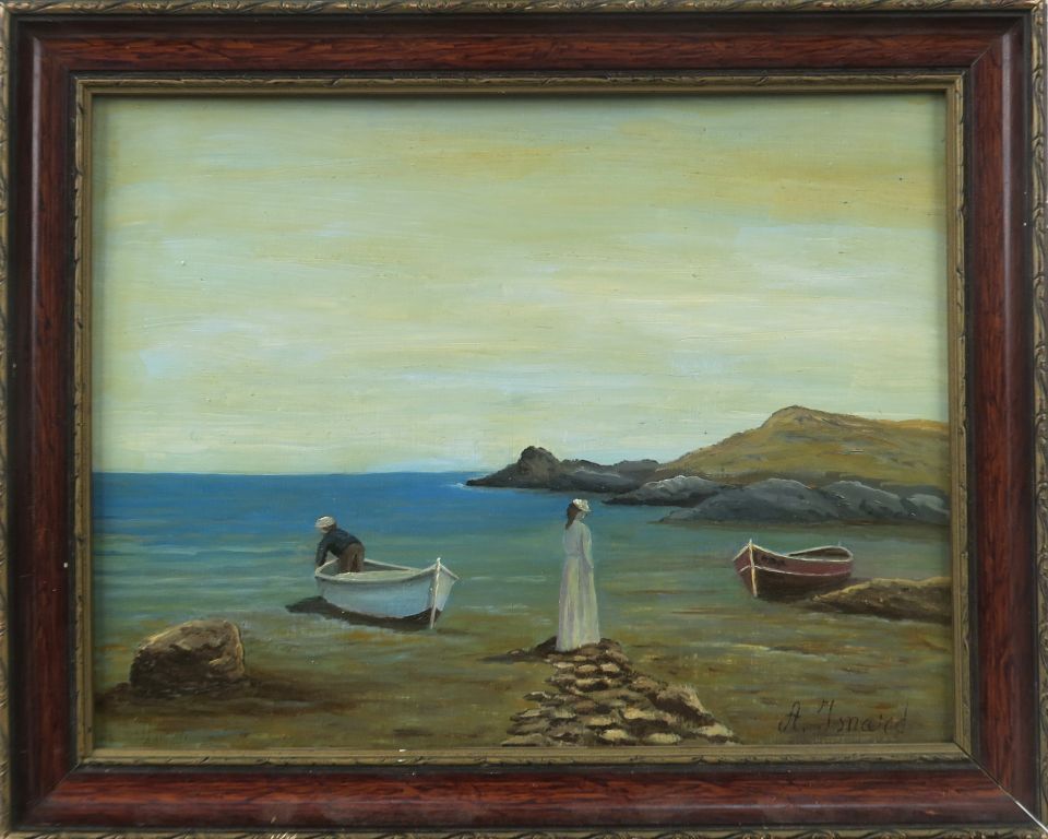 ISNARD. "Personnages en bord de mer". Huile sur isorel, signée en bas à droite. Dim. 22 x 28,5 cm.