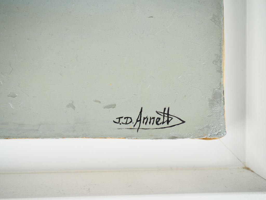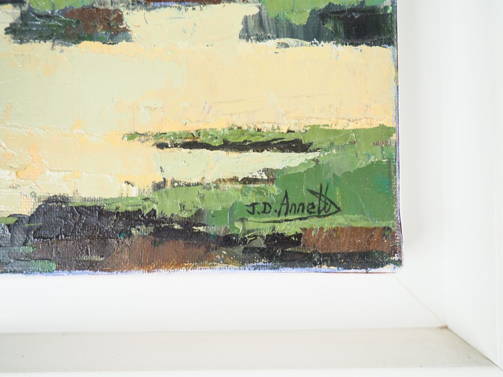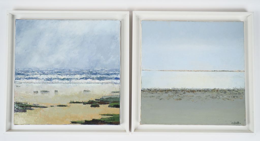 J.D ANNETT. "Côte ouest" et "Lueur". 2 huiles sur toiles en pendant, signées en bas à droite. Dim. 40 x 40 cm.
