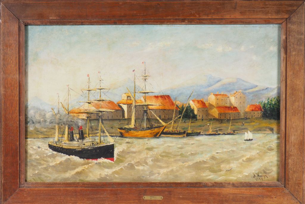 J. HERZOG. "Marine" Huile sur toile, signée en bas à droite (petites restaurations) Dim. 49,5 x 80,5 cm