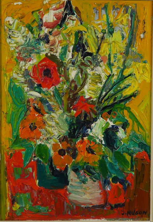 J. HUGON. "Bouquet de fleurs" Huile sur toile. Signée en bas à droite. Dim. 54 x 37 cm (accidents et sauts de peinture)