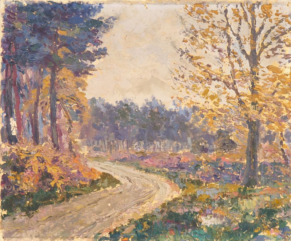 Jacques NIEUDAN. "Chemin en bord de forêt". Huile sur toile signée en bas à droite et datée 1917. Dim. 38 x 46 cm. (Sauts de peinture et accidents).