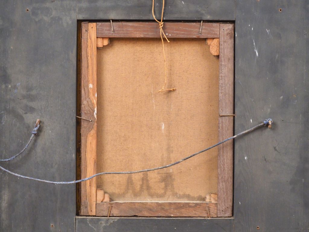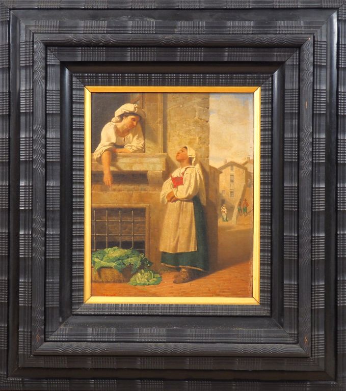 Jacques PILLIARD. "Discussion au bord de la fenêtre". Huile sur toile signée en bas à gauche. Dim. 41 x 32 cm.