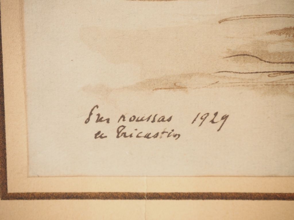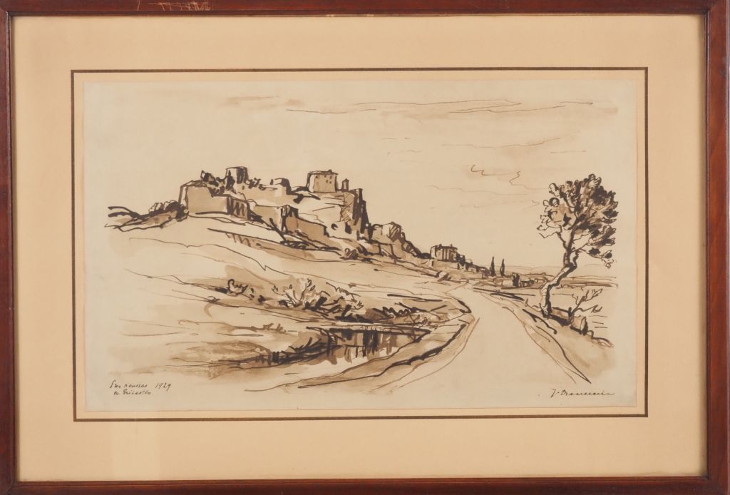 Jacques TRAVERSIER. "En roussas, en Tricastin" Encre, signée en bas à à droite située et datée 1929 en bas à gauche Dim. 25 x 42 cm