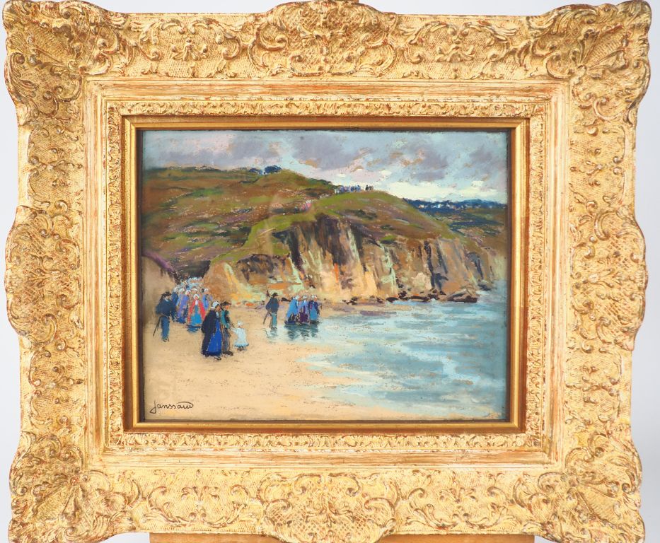 JANSSAUD. "Plage bretonne animée". Pastel, signé en bas à gauche. Dim....