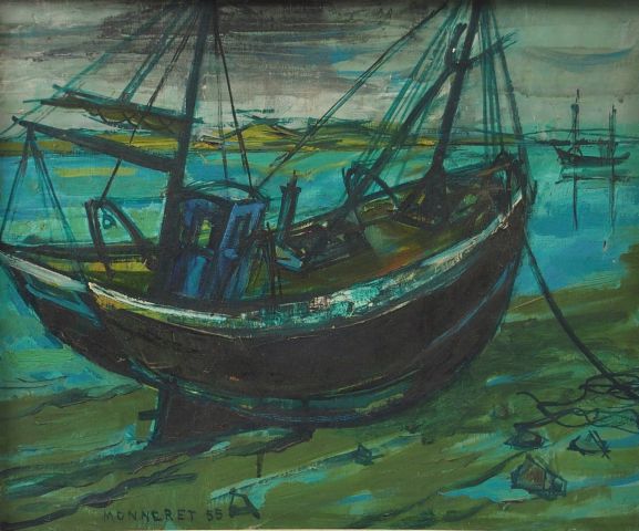 Jean MONNERET, " Bâteaux à marée basse ". Huile sur toile, signée en bas à gauche et datée 55. 33 x 41cm