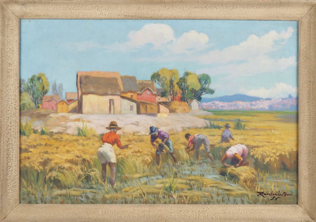Jean RAMBININTSOA. "les moissons à Madagascar" Huile sur isorel, signée en bas à droite et datée 55 Dim. 40,5 x 60 cm