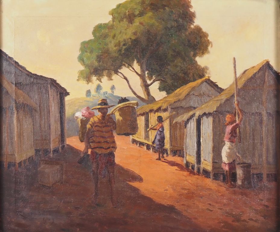 Jean RAMBININTSOA. "scène de la vie quotidienne dans un village malgache" Huile sur toile, signée en bas à droite et datée 29 Dim. 50 x 60 cm