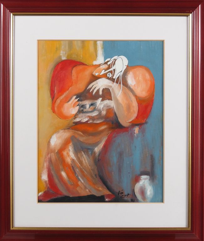 Juan COOK. "Le repos du chat" Huile sur carton, signée en bas à droite Dim. à vue 36 x 28 cm