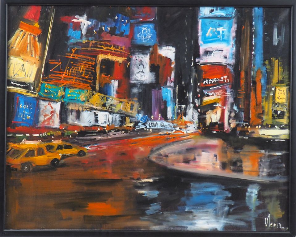KLEINER. "Nuit sur Tames Square". Huile sur toile, signée en bas à droite. Dim. 72 x 91 cm.