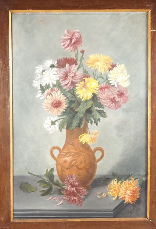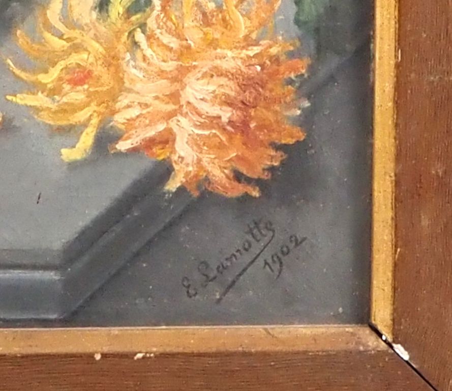 LAMOTTE. "bouquet de chrysantèmes" Huile sur toile, signée en bas à droite Dim. 100 x 66 cm (petit accident, restaurations)