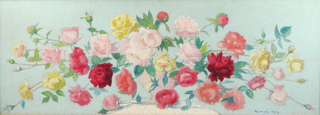 LAUGÉ Achille, 1861-1944 "Grand bouquet de roses sur un entablement", 1939 Huile sur panneau. Signée et datée en bas à droite. 50,5x138 cm Cette oeuvre sera insérée dans le Catalogue raisonné de l'artiste actuellement en préparation par Nicole Tamburini. Un certificat de Madame Nicole Tamburini sera délivré à l'acquéreur. Experts : Michel et Raphaël Maket