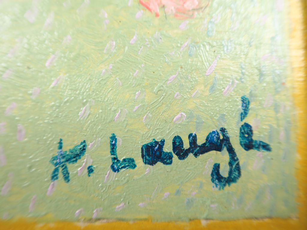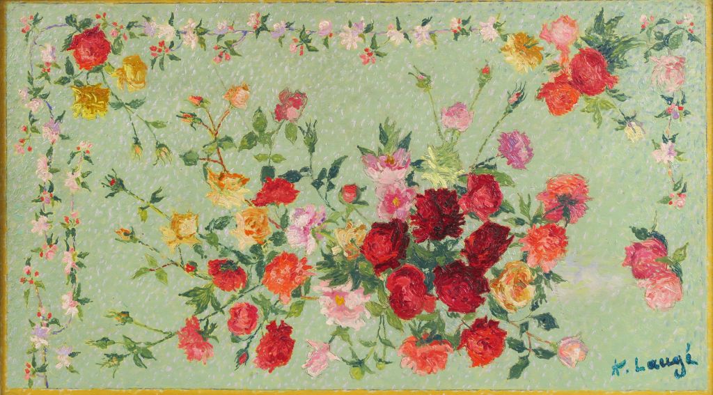 LAUGÉ Achille, 1861-1944 "Jeté de roses entouré d’une guirlande de branches de pommier" Huile sur panneau. Porte le cachet de la signature en bas à droite 26,5x46,5 cm Cette oeuvre sera insérée dans le Catalogue raisonné de l'artiste actuellement en préparation par Nicole Tamburini. Un certificat de Madame Nicole Tamburini sera délivré à l'acquéreur. Experts : Michel et Raphaël Maket