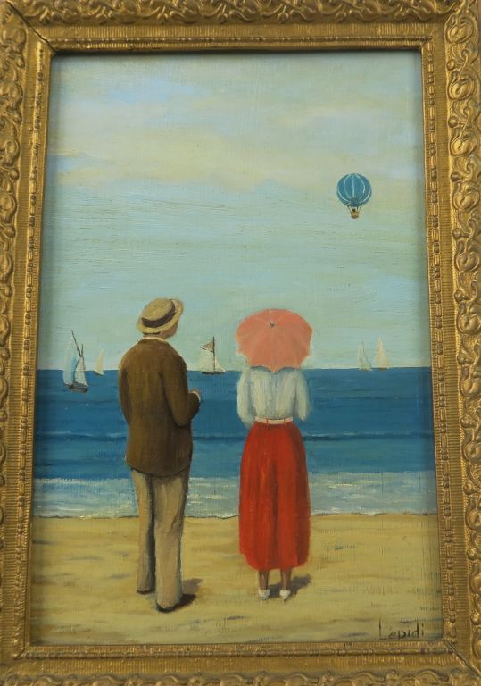 LEPIDI. "Elégants sur la plage". Huile sur panneau, signée en bas à droite. Dim. 29,5 x 20 cm.