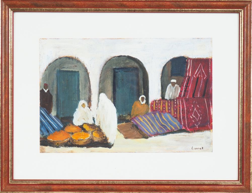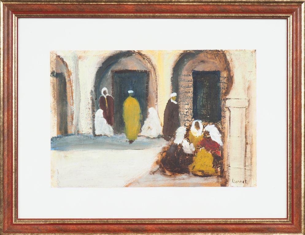 LIONNET. "Le souk". Paire d'huiles sur papier signées en bas à droite. Dim, (à vue) : 19,5 x 29,5 cm.