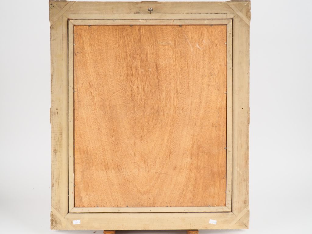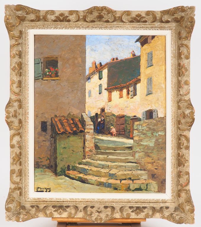 Louis MOURGUES. "Discussion dans la ruelle". Huile sur panneau signée en bas à gauche. Dim. 55 x 46 cm.