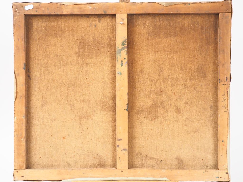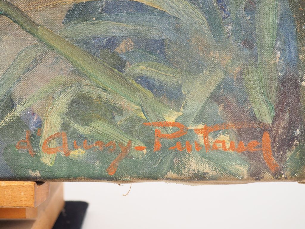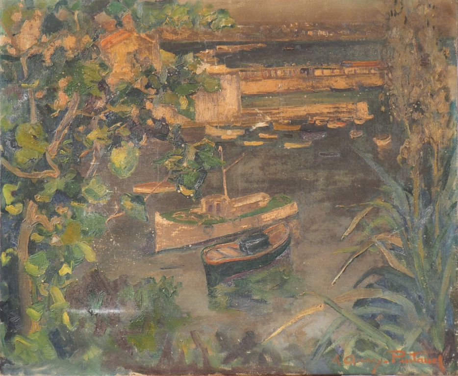 Louise D'AUSSY PINTAUD. "Barques dans le port". Huile sur toile, signée en bas à droite. Dim. 53 x 65 cm.