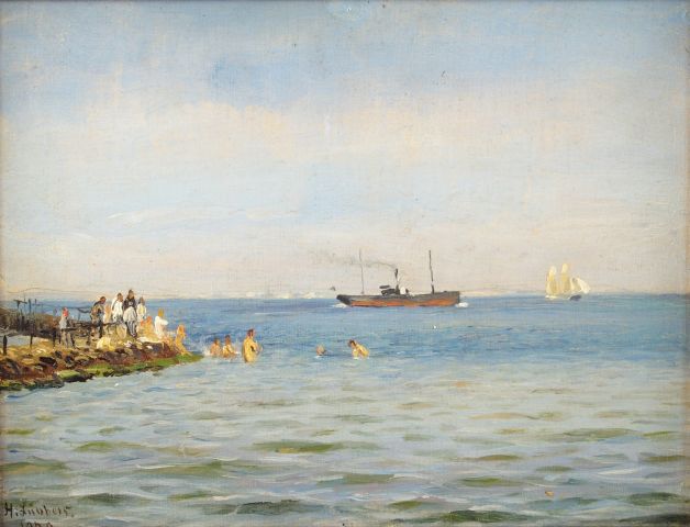 LUBBERS 'Marine et baigneurs'. Huile sur toile, signée en bas à gauche et datée. 21 x 27,5 cm