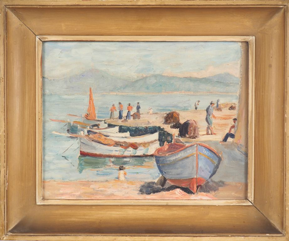 Maggy MONIER "Le port de pêche" Huile sur toile. 27,5 x 35,5 cm
