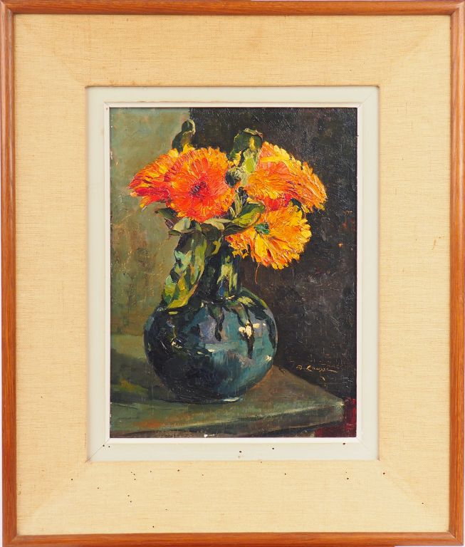 Lot de Marcel CAUSSE "Les soucis" Huile sur panneau. Signée en bas à droite. au prix de 80 à 120 € en vente aux enchères par l'hôtel des ventes Primardeco