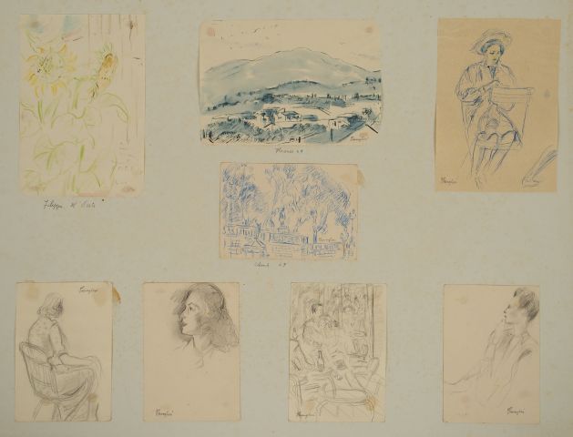 Mario CAVAGLIERI. Ensemble de 8 croquis au crayon , crayons de couleurs, stylo ou aquarelle : 'personnages', 'tournesols', 'Vue de Florence', 'Vue d'Auch'. Signés, sauf un. Dimensions de la plus grande feuille : 20 x 13,5 cm