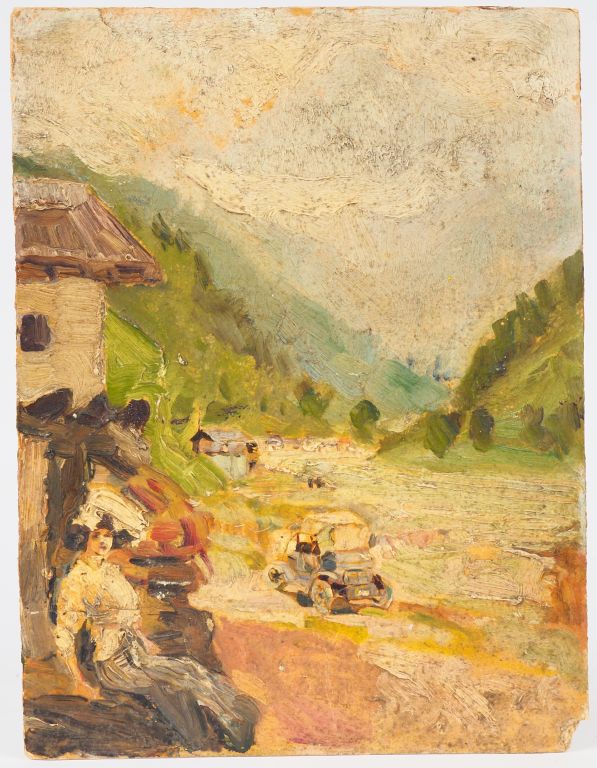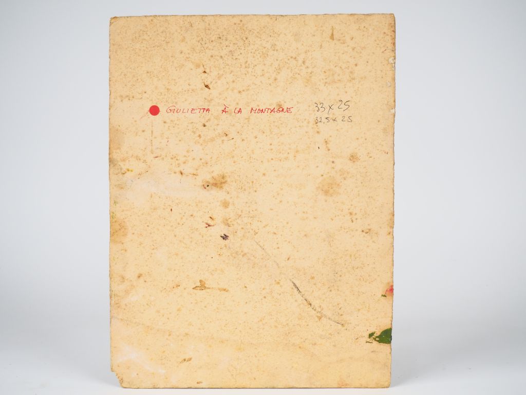 Mario CAVAGLIERI. "Giulietta à la montagne" Huile sur carton, titrée au dos Dim. 32,5 x 24,5 cm (manque à l'angle droit)