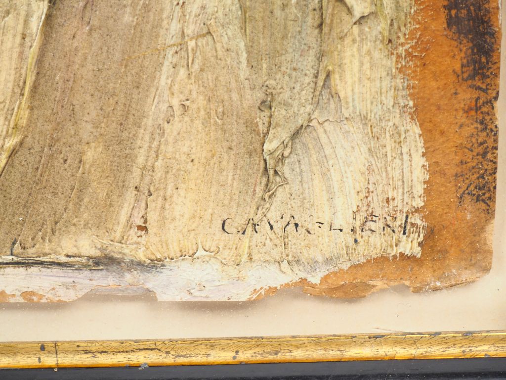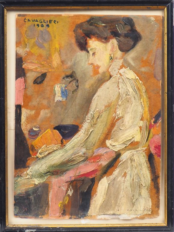 Mario CAVAGLIERI. "Giulietta (?) au piano" Huile sur carton, signée en bas à droite Dim. 32,5 x 23 cm