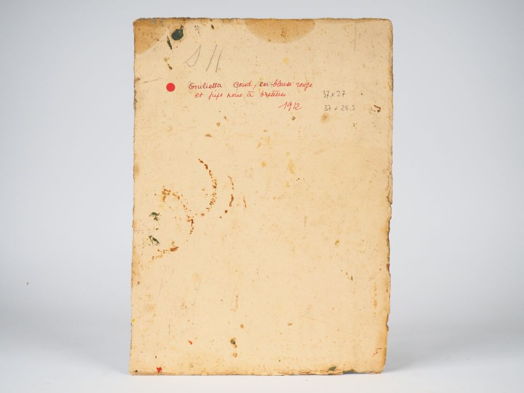 Mario CAVAGLIERI. "Giulietta coud en blouse rouge et jupe noire à bretelles" Huile sur carton, signée en bas à droite et datée 1912 Dim. 36,5 x 26,5 cm
